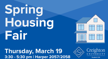 Join us to learn more about housing options for next year and have a chance to win a raffle prize sponsored by Creighton Students Union! We will have representatives from various properties around Omaha so you can learn more about where you might want to live!